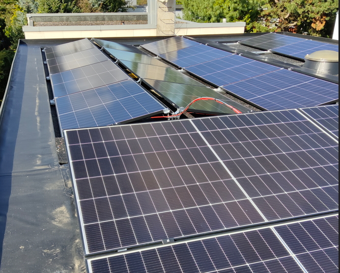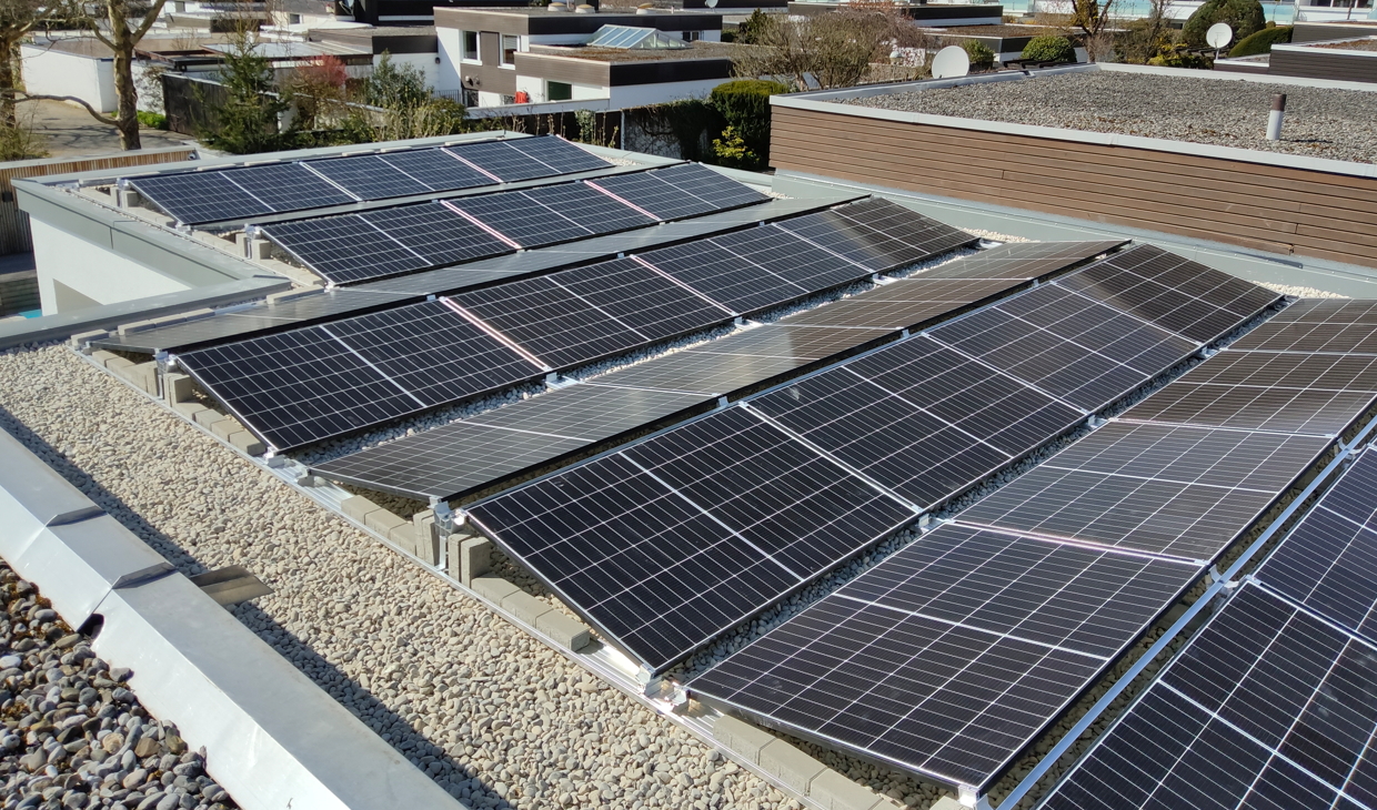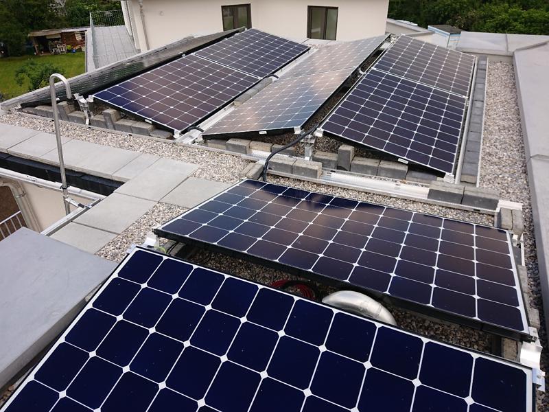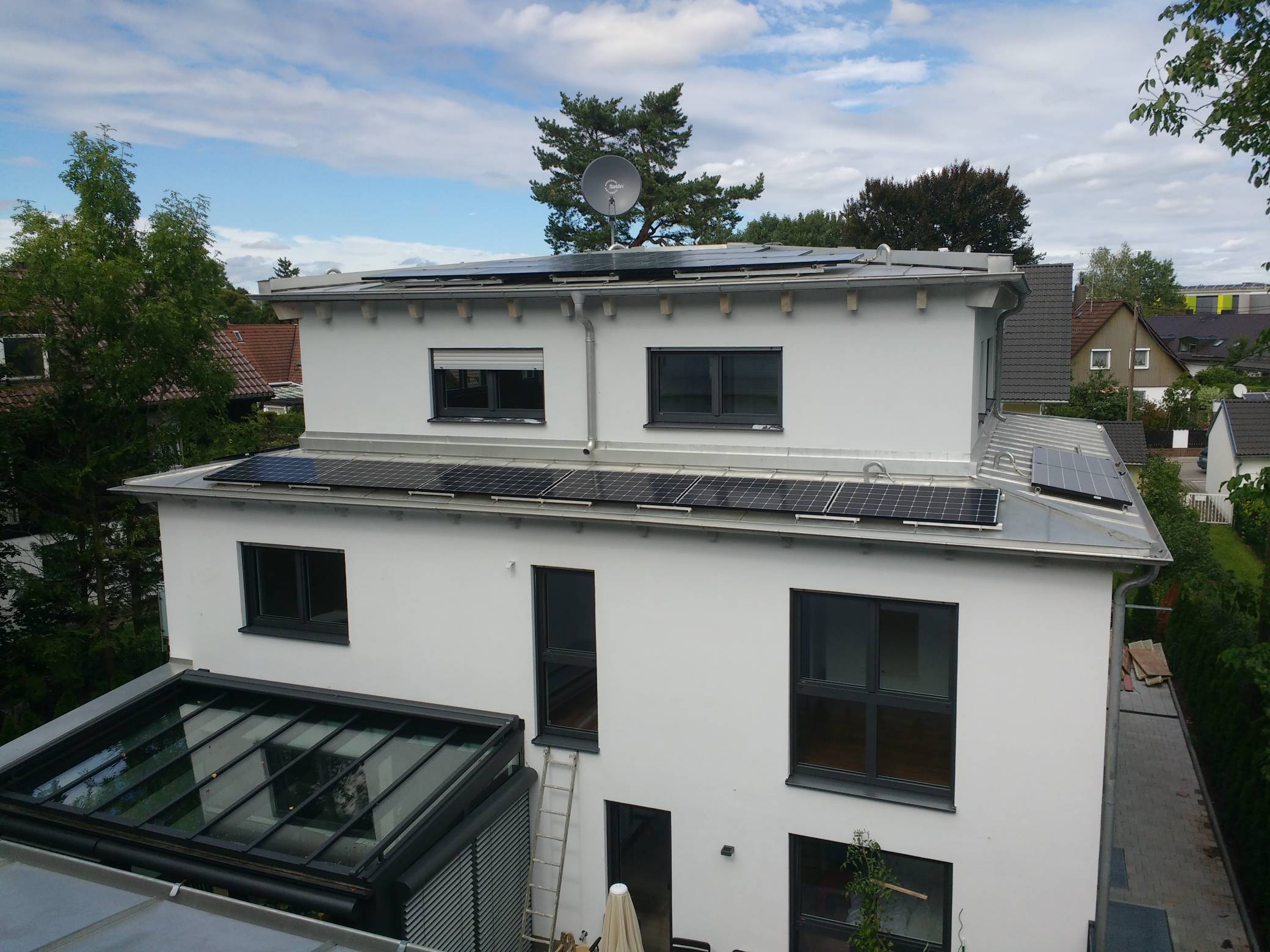 Beschreibung: Flachdach mit Ost-West und Südaufständerung, Fassadenanlage, Einspeisemanagement mit SMA Homemanager, BYD HVM 13.8.