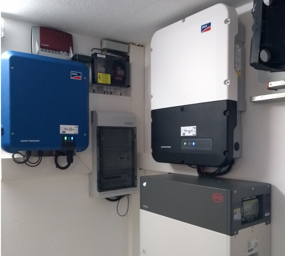 Wechselrichter: SMA STP 10.0-3AV-40 und SMA SBS3.7, Stromspeicher BYD B-Box HVM mit 13,8 kWh